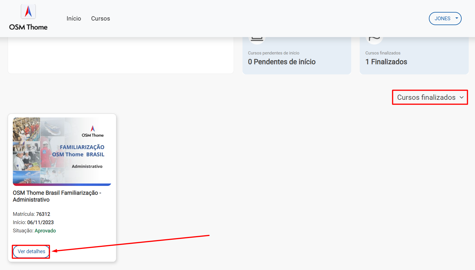 4) Estando em Cursos finalizados, clique no botão Ver detalhes do curso que você já finalizou e deseja assinar e emitir o certificado de conclusão:
